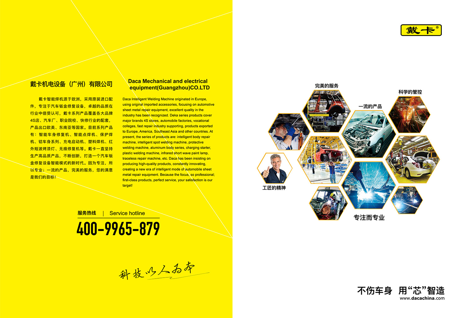 戴卡智能焊機源于歐洲,采用原裝進口配件,專注于汽車鈑金修復設備,卓越的品質在行業中倍受認可,戴卡系列產品覆蓋各大品牌4S店、汽車廠、職業院校、快修行業的配套,產品出口歐美、東南亞等國家。目前系列產品有:智能車身修復機、智能點焊機、保護焊機、鋁車身系列、充電啟動機、塑料焊機、紅外短波烤漆燈、無痕修復機等。戴卡一直堅持生產高品質產品,不斷創新,打造一個汽車鈑金修復設備智能模式的新時代。因為專注,所以專業;一流的產品,完美的服務,您的滿意是我們的目標!